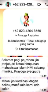 HMIMimika – Ketua Himpunan Mahasiswa Islam (HMI) cabang persiapan Mimika Prayoga Romin Saputra menegaskan agar masyarakat tidak percaya jika ada oknum yang mengirim pesan Whatsapp mengatasnamakan dirinya dan organisasi dengan tujuan meminta sejumlah uang.